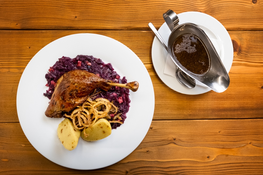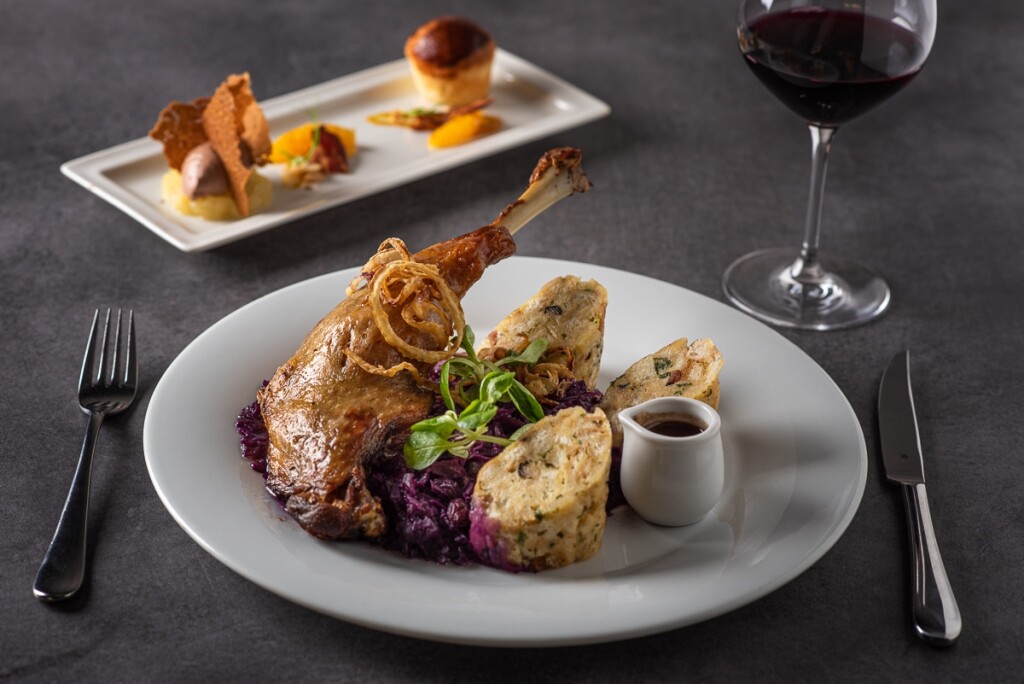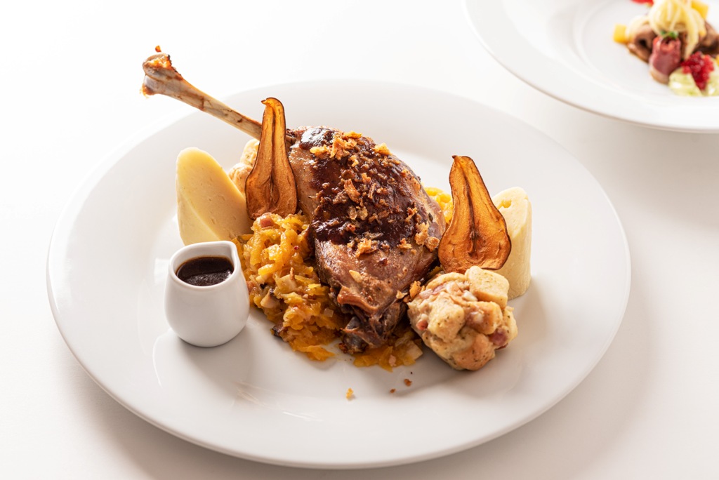 Pomalu pečené husí stehno s červeným zelím a sušenými švestkami, karlovarský knedlík se škvarkami 590 Kč