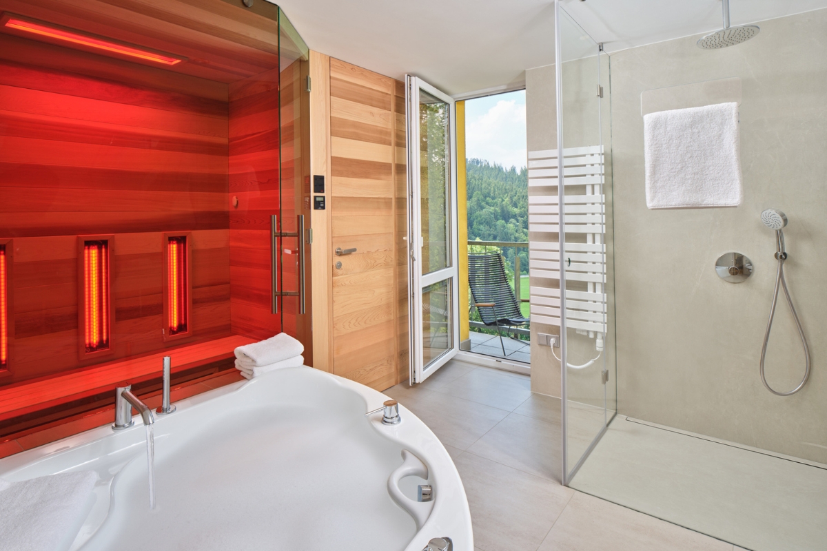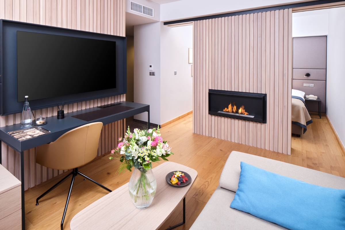 Pokoj Grand Suite 314 je navržen tak, aby splnil požadavky i těch nejnáročnějších hostů. Těšit se můžete především na vlastní whirlpool vanu, infrasaunu, lihový krb a také komfort v podobě dvou televizí – jednu najdete v ložnici a druhou v obývacím pokoji.