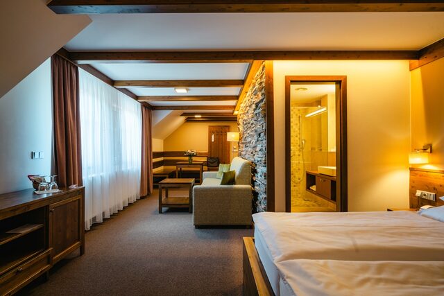 Luxusní rodinný pokoj se stylovou obývací částí, vlastní saunou, krbem a balkonem