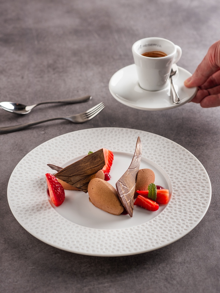 Lískooříšková panna cotta, karamelový oplatek, kávová zmrzlina