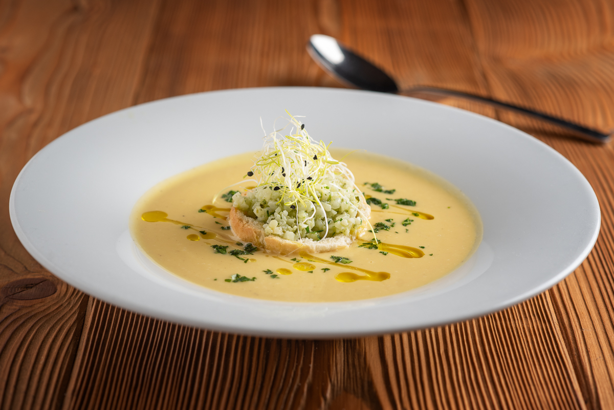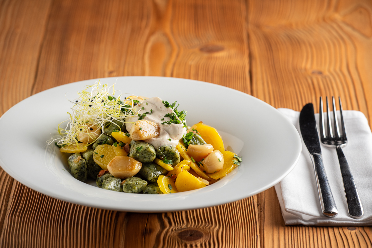 | Špenátové noky se slaninou, česnekem a žlutou karotkou, créme fraiche s růžovým pepřem /FOTO/ | 240 Kč |