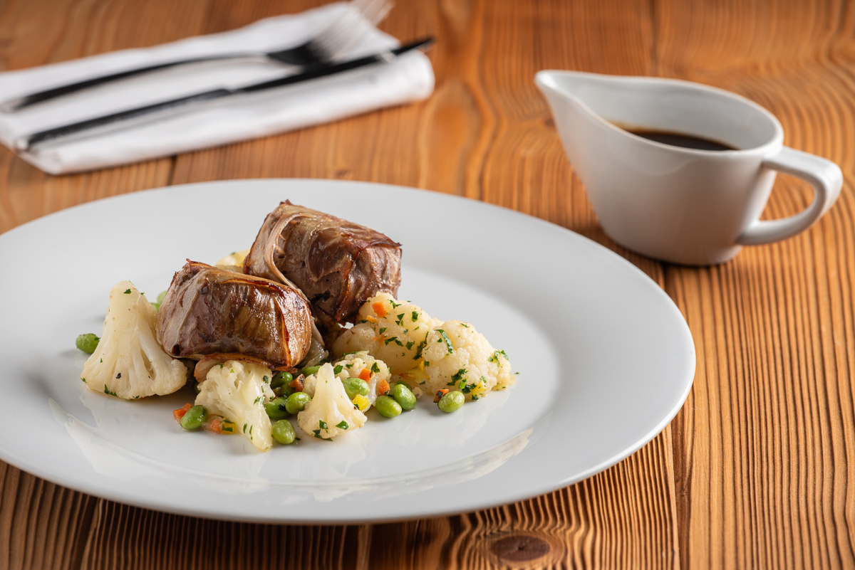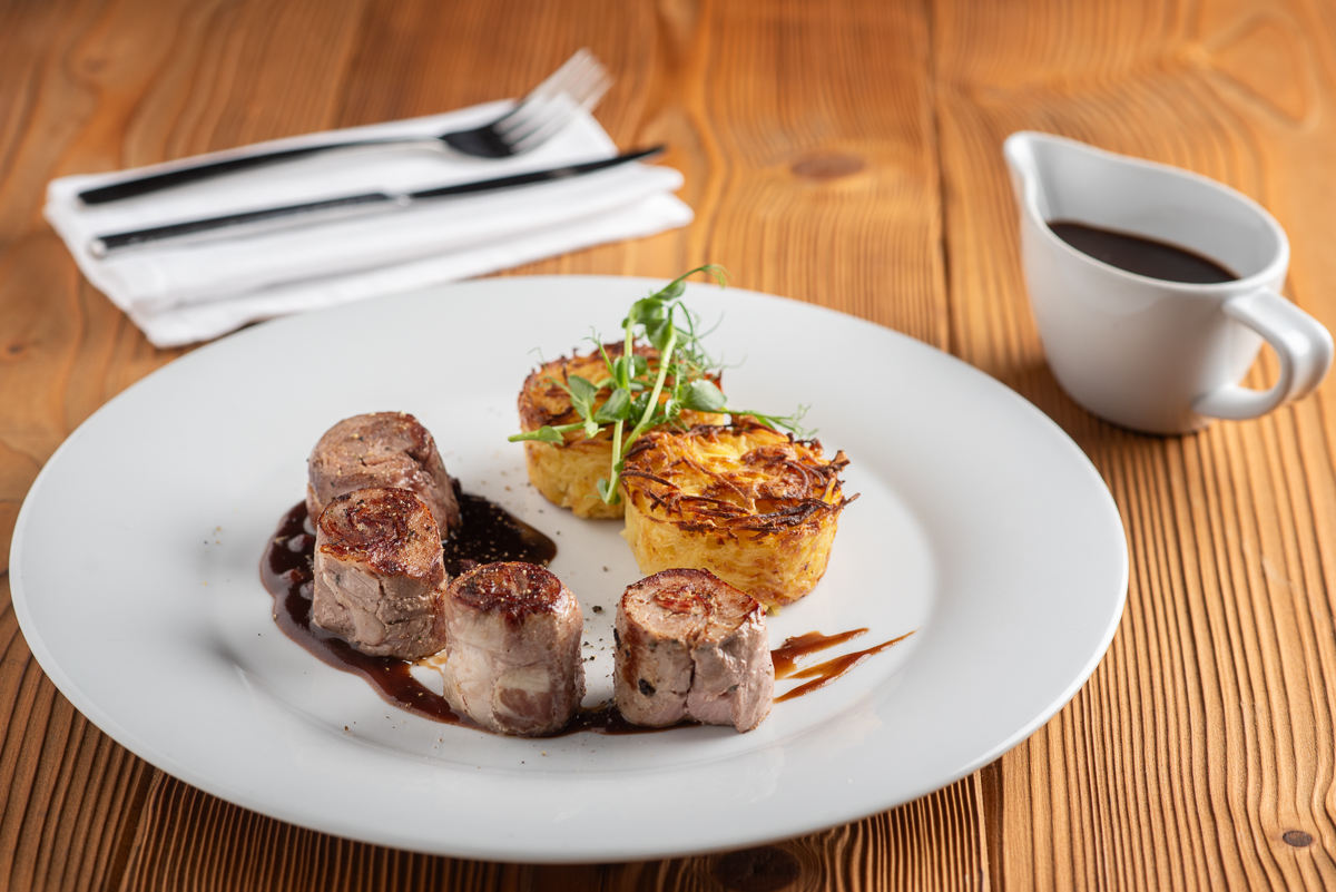 | Rolovaný kančí hřbet s pancettou a tymiánem, brusinkovým demi-glace, gratinované brambory |