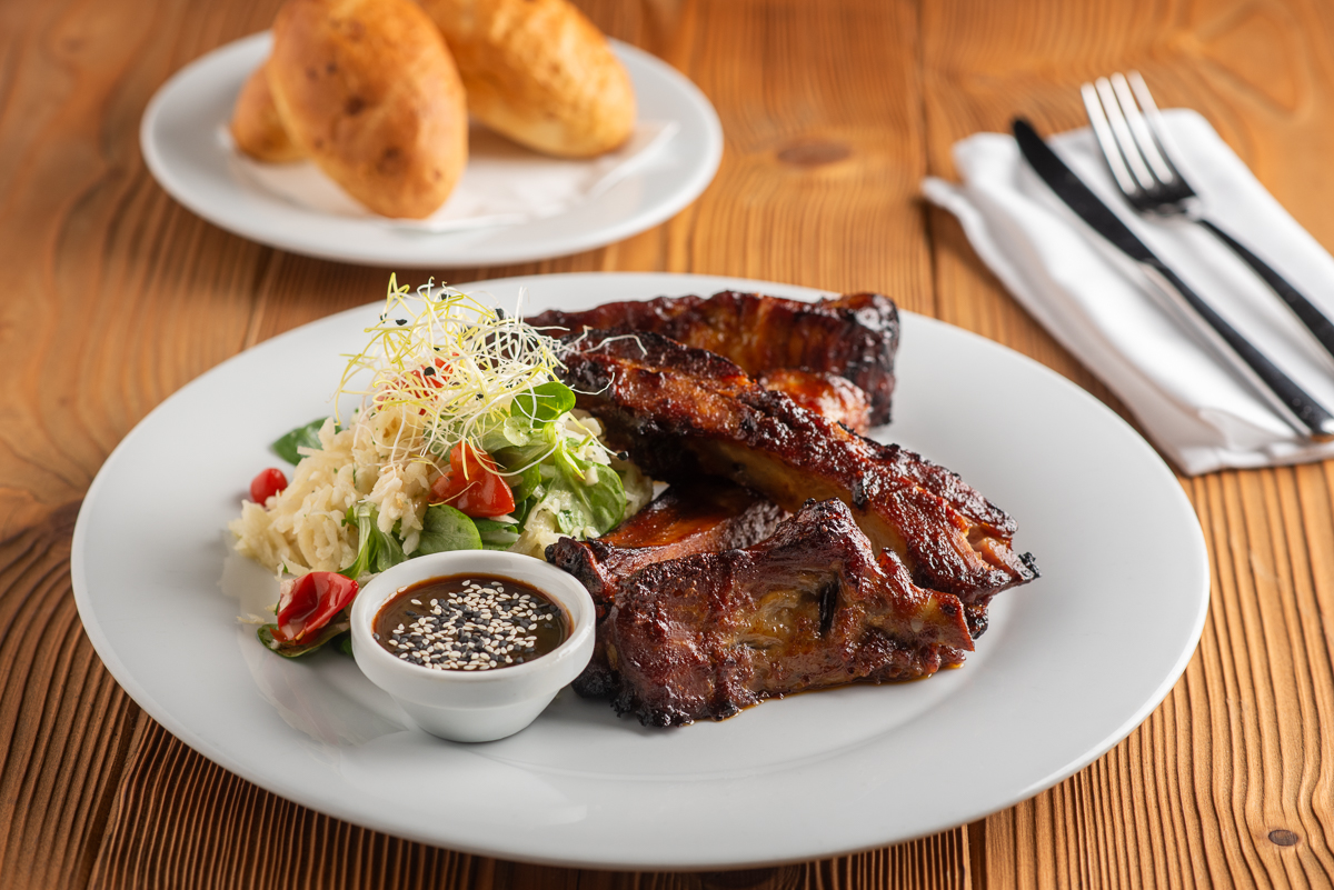 | Marinovaná vepřová žebra se salátem z pikantního nakládaného zelí a sezamovou redukcí |