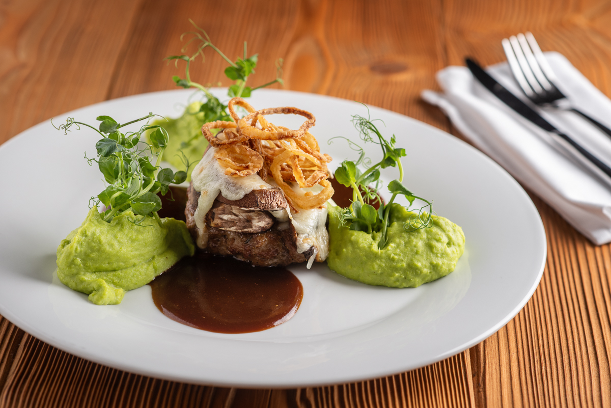 | Gratinovaný jehněčí karbanátek s hříbky portobello a sýrem pecorino, hráškové pyré |