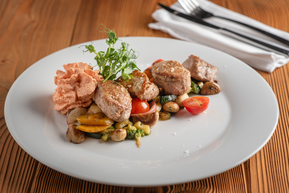 | Medailonky z vepřové panenky s grilovanou zeleninou a espumou z cherry rajčat |