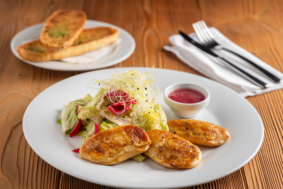 | Pršut z kachních prsou s fenyklovým coulis, hruškovým želé a drcenými restovanými piemontskými lískovými oříšky |