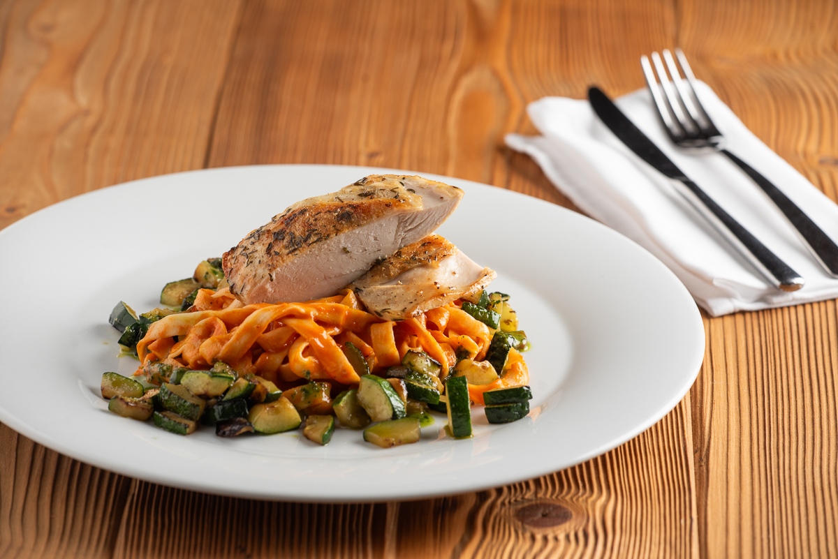 | Grilovaný kuřecí steak s cuketou a omáčkou z pečených paprik, tagliatelle /FOTO/ | 340 Kč |
