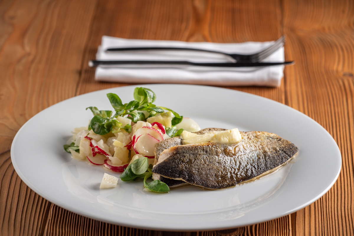 | Filet ze pstruha s citronovým máslem a salátem z fermentované kedlubny a ředkviček |