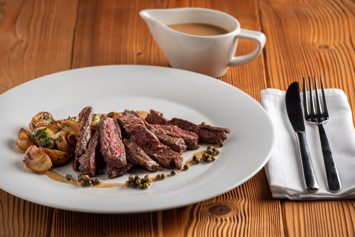 | Filírovaný hovězí Rump steak z řeznictví Klouda s jemnou pepřovou omáčkou a restovanými žampiony |