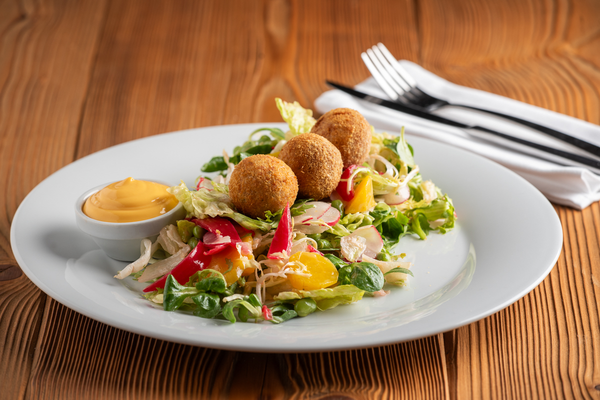 | Listový salát se zeleninou a smaženými kroketami z králičího masa, čedarová majonéza /FOTO/ | 290 Kč |
