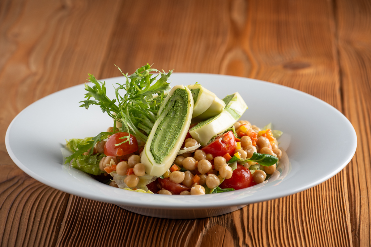 | Cizrnový salát s polníčkem a cherry rajčaty, sýrová rolka se špenátem |
