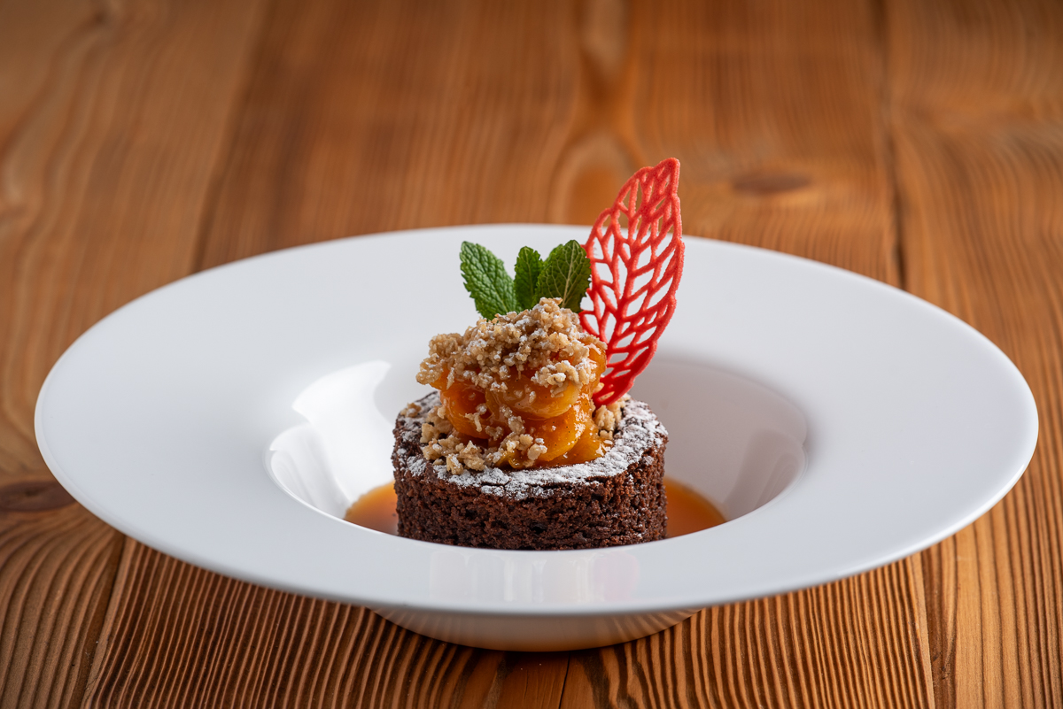 | Čokoládové brownies s meruňkovou omáčkou a bezovým crumblem |